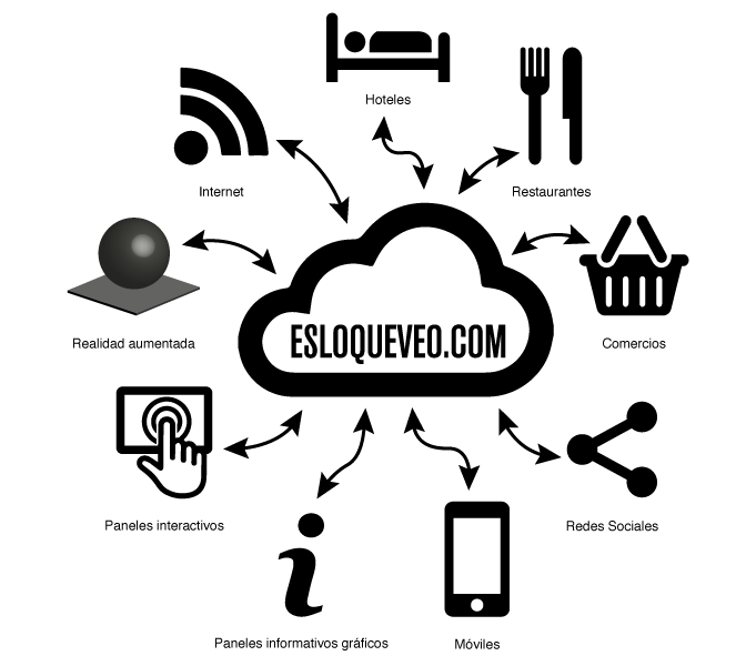La plataforma Esloqueveo permite organizar un sistema de información multimedia de conocimiento y comercio electrónico, accesible desde cualquier terminal: PC, Teléfono móvil convencional, SmartPhones, pantallas publicitarias, etc.